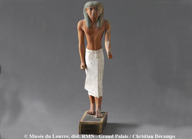 This is the walking man. The statuette of this unknown man was found in his grave during excavations. He might have been a senior official of Pharaoh, the king of Egypt. The deceased was represented in the action of walking. But a walk that is not natural: his back is stiff as well as his two legs. It doesn't matter to our unknown man. Indeed, for the Egyptians, representation has a magical function. The simple fact of being sculpted on the move ensures the dead the possibility to move in the hereafter as on Earth, and for eternity.