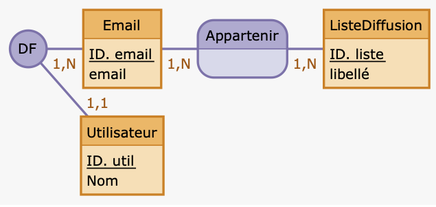 Si on considère un modèle avec des Utilisateurs, des Emails et des Listes de Diffusion, on peut considérer qu’un utilisateur peut avoir plusieurs adresses mail, qu’une liste de diffusion contient différents emails et qu’un email peut apparaitre dans plusieurs listes de diffusion :