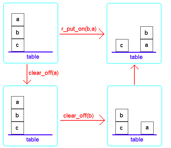 Evidemment, pour que les préconditions soient vérifiées, il suffit de réaliser des actions qui les rendent vraies, ce qui peut amener à définir des actions récursives. Ecrire une version récursive de met_sur en définissant un prédicat liberer qui rend vraie la précondition libre en réalisant une action si besoin. Cette version récursive devrait permettre de mettre le bloc b sur le bloc a en passant par plusieurs étapes intermédiaires, comme dans le dessin suivant (où r_put_on(X,Y) est la version récursive d'un prédicat non récursif put_on(X,Y)):