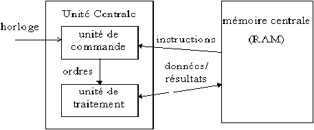 Une particularité fondamentale de la mémoire centrale, dans l'architecture de Von Neumann, c'est qu'elle sert à stocker indifféremment aussi bien des bits codant des données que des bits codant des traitements, des instructions (on verra par la suite comment coder une instruction dans un mot mémoire). Il n'y a pas de distinction entre les deux, pas de séparation. On retrouve là ce qui caractérisait également les Machines de Turing Universelles, sur le ruban desquelles pouvait figurer aussi bien des données que le code d'une autre machine de Turing (cf. 3.6). Cette capacité à coder avec des 0/1 aussi bien des données que des traitements, c'est le fondement de l'informatique.![]()