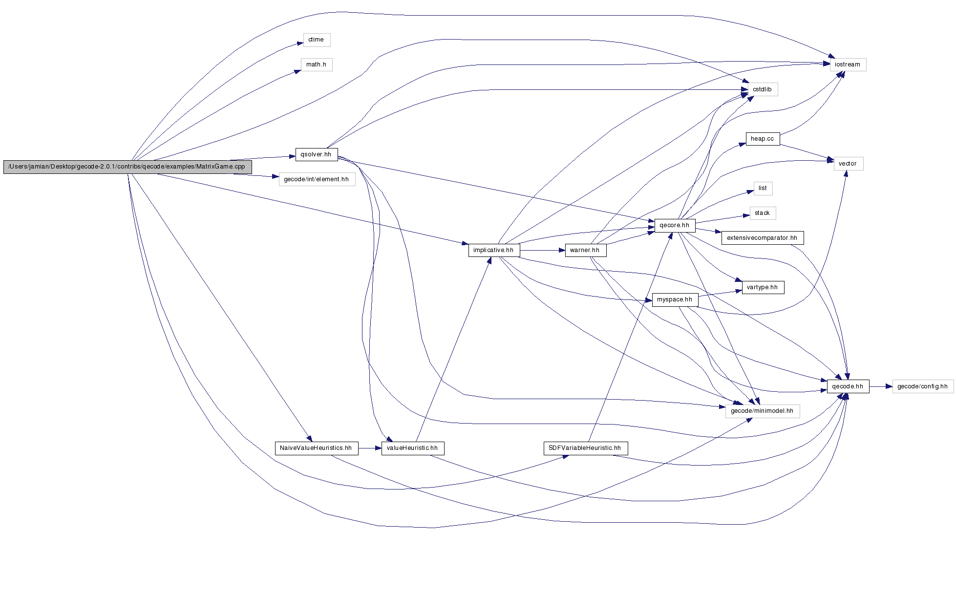 #include <cstdlib>#include <ctime>#include <math.h>#include <iostream>#include "gecode/minimodel.hh"#include "gecode/int/element.hh"#include "qsolver.hh"#include "implicative.hh"#include "SDFVariableHeuristic.hh"#include "NaiveValueHeuristics.hh"Include dependency graph for MatrixGame.cpp: