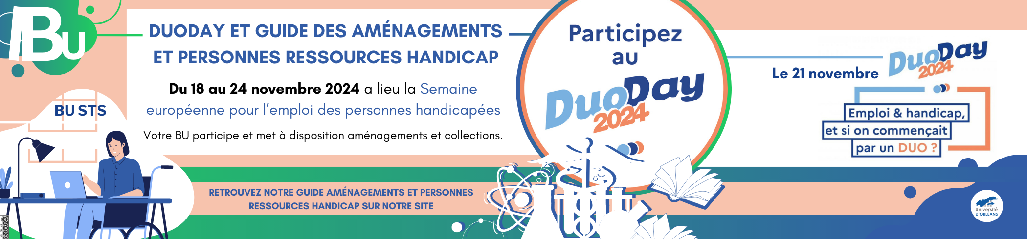 Du 18 au 24 novembre 2024 a lieu la Semaine européenne pour l’emploi des personnes handicapées. Le DuoDay a lieu à cette occasion à l’Université d’Orléans. La BU STS participe naturellement au DuoDay mais aussi de manière plus large.